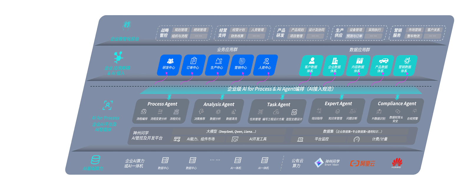 端到端的一站式AI工作空间深度融合了从企业战略规划到日常经营的全流程业务板块,,,,定向解决车企内部领域多、、部门多、、、、链条长、、场景碎片化等难题,,支持车企快速构建以AI为核心的生产力写作体系,,,,实现任务执行与AI能力的无缝集成与交互