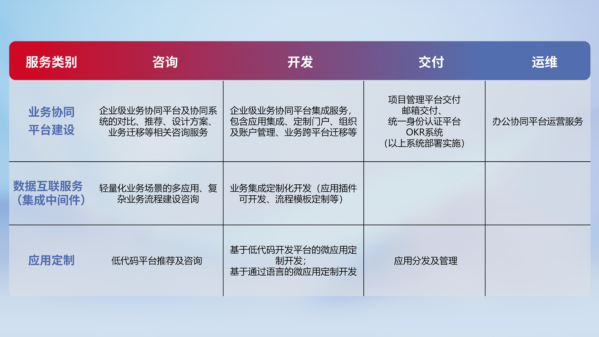 针对钉钉、、企微、、、IDaas等平台级产品提供产品的规划、、、、方案、、、交付、、定制化开发等服务,,,,实现如统一协同办公、、、、智能客户服务、、、混合会议管理、、智能数据查询、、、、等业务场景,,,,实现数字化转型。。。